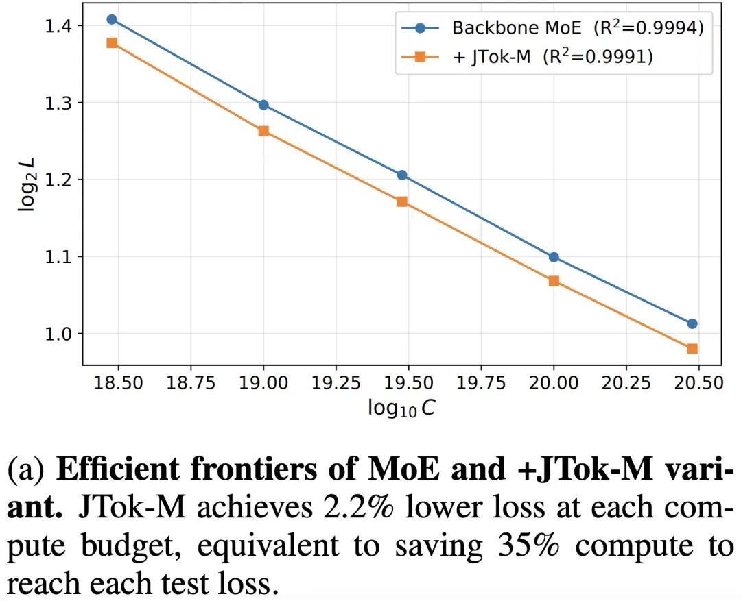 后续的严格实验也完全验证了这个猜想:在对数坐标下,JTok-M 的性能 - 算力前沿拟合线和原生模型基线几乎完全平行,只是整体下移了一个固定间隔。计算得出:要达到和原生 MoE 同等的模型性能,JTok-M 能直接节省 35% 的训练算力,这个节省比例在不同模型规模和训练预算下都成立,验证了理论中的 scale-invariance 。对企业来说,这就是实打实的降本增效,同样的预算能训练出更强的模型,或者用更少的成本达到目标效果。