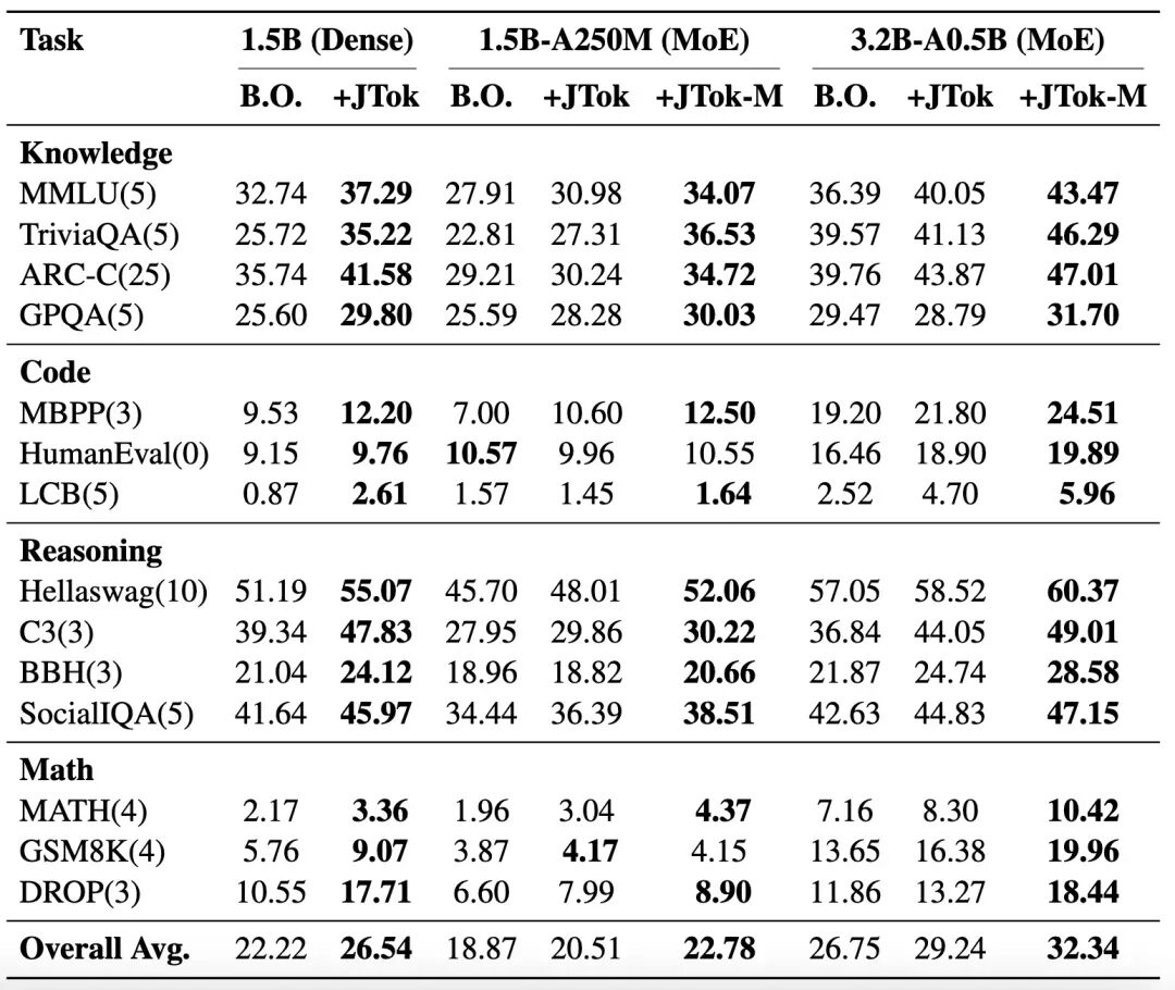 作者做了超全面的验证:覆盖知识、推理、代码、数学四大类共 14 个子任务,在 dense 和 MoE 两种基座、多种参数规模的模型上测试,全程保持 backbone、训练数据、训练流程完全一致,只外挂 JTok/JTok-M 模块,结果堪称全任务提分,而且模型越大、任务越难,收益越明显!