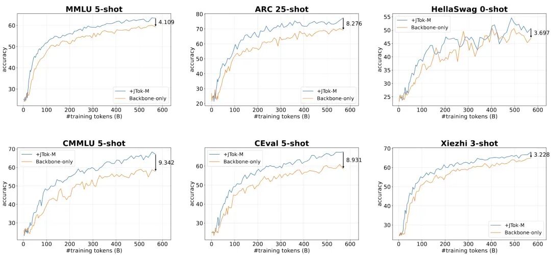 样本效率超高:训练刚进行到几 B token 时,加了 JTok-M 的模型就已经全面反超原生 MoE,不用等训练后期,就能看到明显提升;