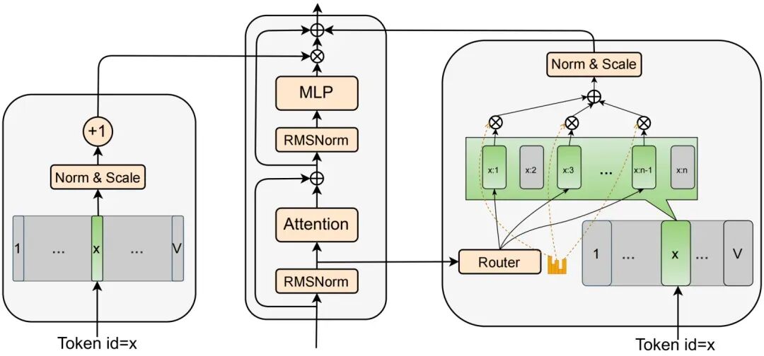 算法设计的核心思想是用 token-id 直接查表取得调制向量,再以元素级乘加方式注入主干,实现模型容量提升,而 FLOPs 几乎不变。