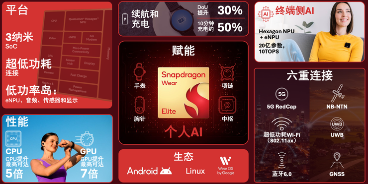 数据显示,骁龙可穿戴平台至尊版可实现日常使用时长(DOU)提升30%,同时可在仅10分钟之内充电约至50%。