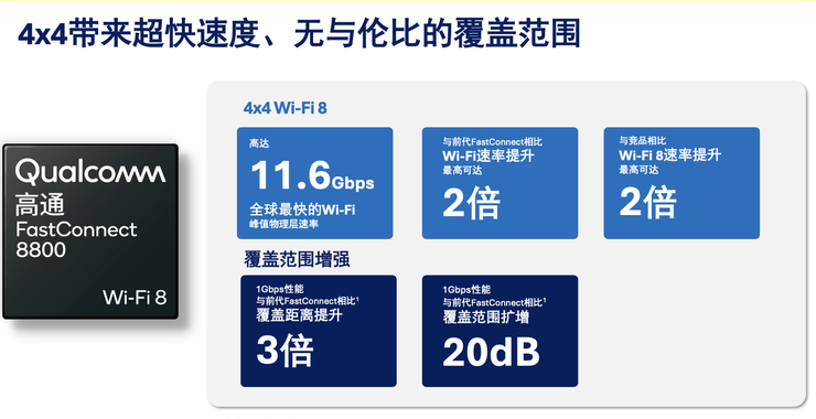 FastConnect 8800的发布标志着移动Wi-Fi进入4x4时代,在部分地区,其峰值物理层速率可达11.6Gbps,速率及覆盖距离较上一代提升两倍。与竞品相比,高通的Wi‑Fi 8速率是其2倍。