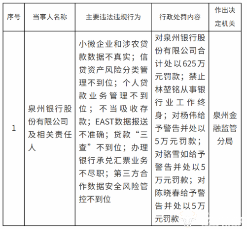 具体来看,泉州银行因小微企业和涉农贷款数据不真实,信贷资产风险分类管理不到位,个人贷款业务管理不到位,不当吸收存款,EAST数据报送不准确,贷款“三查”不到位,办理银行承兑汇票业务不尽职,第三方合作数据安全风险管控不到位的违法违规行为,被泉州金融监管分局决定合计处以625万元罚款。