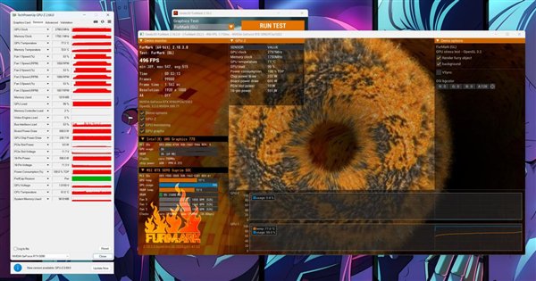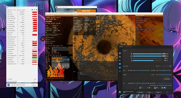 对此Wccftech使用微星RTX 5090 SUPRIM X进行了实际测试,在旧版v591.86驱动下,该卡于Furmark中可实现1.020-1.030V电压及3015-3030MHz频率(核心超频+200MHz、显存+2000MHz、核心电压100%)。