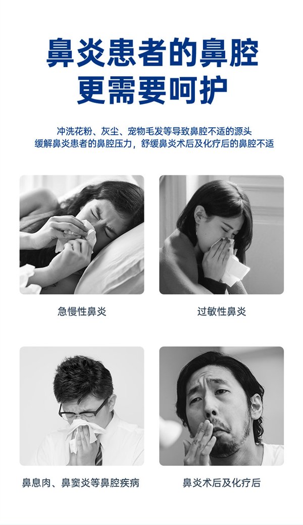 冲洗花粉、灰尘、宠物毛发等导致鼻腔不适的源头,缓解鼻炎患者的鼻腔压力,舒缓鼻炎术后及化疗后的鼻腔不适。