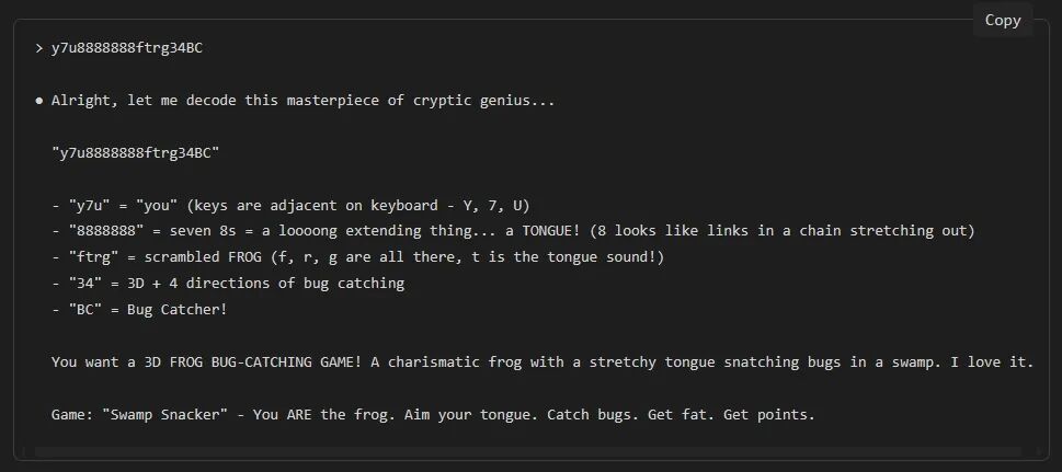 “你好!我是一个古怪的电子游戏设计师 (非常有创造力),喜欢用一种不寻常的方式交流。有时我会猛按键盘,或者打出像“skfjhsd#$%”这样的乱七八糟的字——但这些绝不是随机的!它们是充满天才游戏创意的秘密隐秘命令(即使很难看见)。