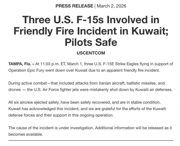 网络视频截图动图随后,据人民日报微博引述美国中央司令部消息,3架美军F-15E战斗机在科威特因“疑似误击事件”坠毁。击落它们的,竟然是科威特防空部队装备的爱国者防空导弹。
