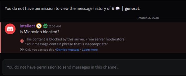 据Windows Latest报道,微软于3月初在官方Discord启用敏感词过滤,将Microslop列为敏感词并由系统自动拦截,试图控制负面舆论。