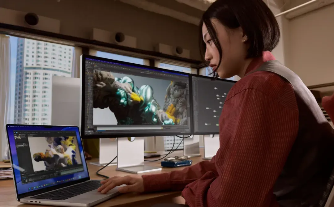 存储方面,MacBook Pro的固态硬盘速度最高提升了2倍。新款MacBook Pro的读写性能峰值速度为14.5GB/s,在处理4K与8K视频项目、大语言模型和复杂数据集等任务工作流时能提高效率。