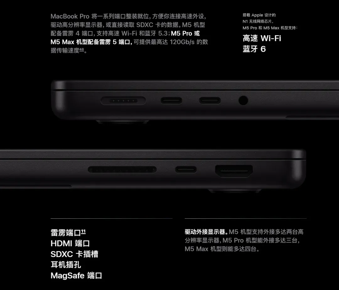 此外,MacBook Pro搭载了N1芯片,支持Wi-Fi 7和蓝牙6。