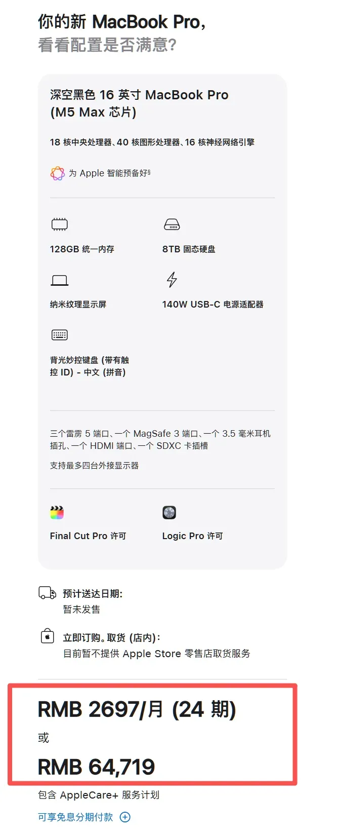 价格方面,14英寸搭载新M5 Pro的MacBook Pro起售价为17999元,存储为24GB+1TB起步,如果是16英寸M5 Max版全部“拉满”,总价最高在64719元,当然,这包含了两款软件和Apple Care服务,去除后大约58124元。