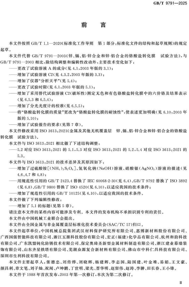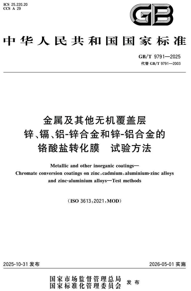 近日,由国家标准化管理委员会批准发布的《GB-T 9791-2025 金属及其他无机覆盖层锌、铝、锌-铝合金、铝-锌合金的铬酸盐转化膜试验方法》国家标准正式落地,该标准将于2026年5月1日起全国实施。广东凯盟钝化防锈技术有限公司作为核心参编单位,全程深度参与标准起草、论证与修订,彰显了在钝化防锈领域的标杆地位。