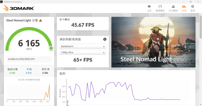 另外在Steel Nomad Light的跑分中,整体的跑分来到6155,其中显卡测试的分数为45.67FPS,并且同样能够在2K分辨率下提供65FPS的游戏帧数,综合性能表现出色。