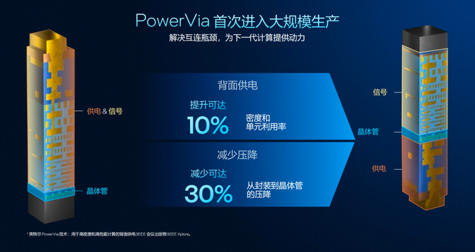 为了实现2位数的性能提升和出色的能耗比表现,这次英特尔Panther Lake的18A带来了两项撒手锏技术,第 一个是RibbonFET,即环绕栅晶体管技术,这项技术能够更好地控制漏电流,第二个则是PowerVia背部供电网络,有效缩短了晶体管与电源之间的距离,使得芯片的密度提升巨大,同时能耗损失降到最低,并且配合上最新的Foveros-S的3D封装技术,良品率也得到了质的飞跃。