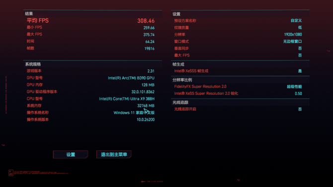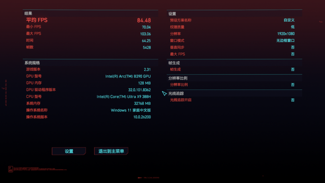《赛博朋克2077》的低特效模式下,分辨率为1080P,英特尔酷睿Ultra X9 388H的平均FPS为84.48,整体游戏测试画面丝滑流畅,没有卡顿的情况发生。