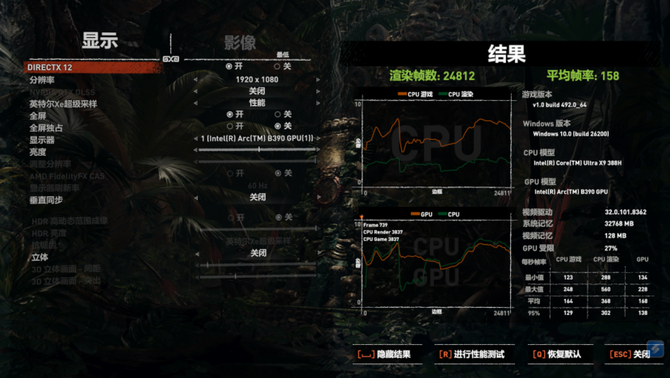 《古墓丽影:暗影》在开启XeSS性能档位之后,同样的1080P分辨率下,低特效,游戏帧数来到了158。