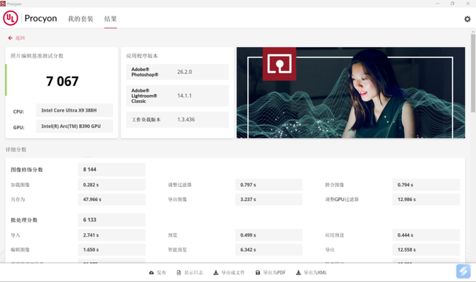 UL Procyon的图片编辑基准测试中,英特尔酷睿Ultra X9 388H的总分数为7067,这个分数能够非常高效地使用LR和PS进行图片的批处理,对于经常需要图片后期的用户来讲,这颗处理器真的非常高效。