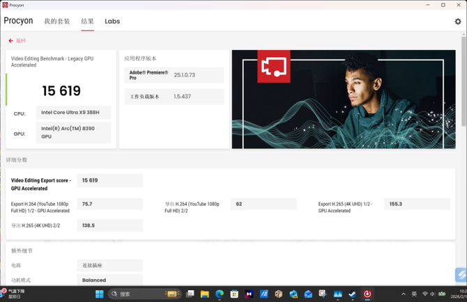 另外后续的UL Procyon的视频内容创作性能上,经过我们的实际测试,分数来到了15619,用户在使用PR进行后期剪辑、导出的过程中,效率都非常高,完全能够满足视频内容创作者的要求。