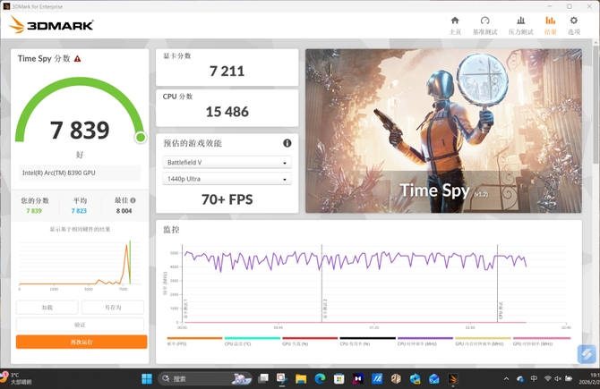 升级了全新架构的英特尔锐炫B390核显之后,英特尔酷睿Ultra这次的图形性能表现着实令人惊艳,首先是基准的3DMARK基准跑分之后,整套平台的跑分来到了7839,其中显卡的分数为7211,根据软件给出的性能参考指标可以看到,在《战地V》的游戏中,能够提供70+FPS的游戏帧数表现。