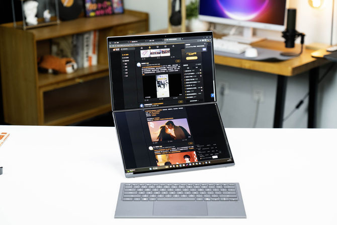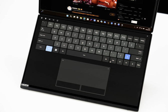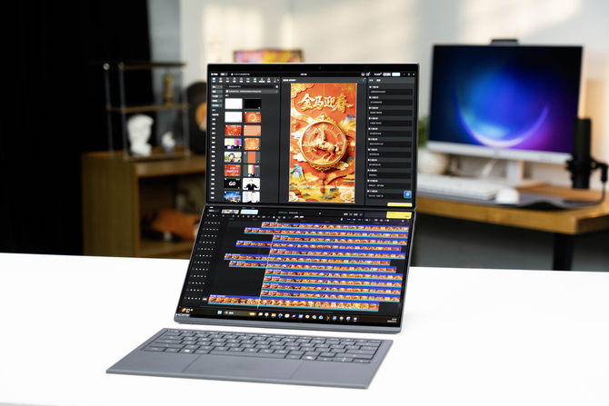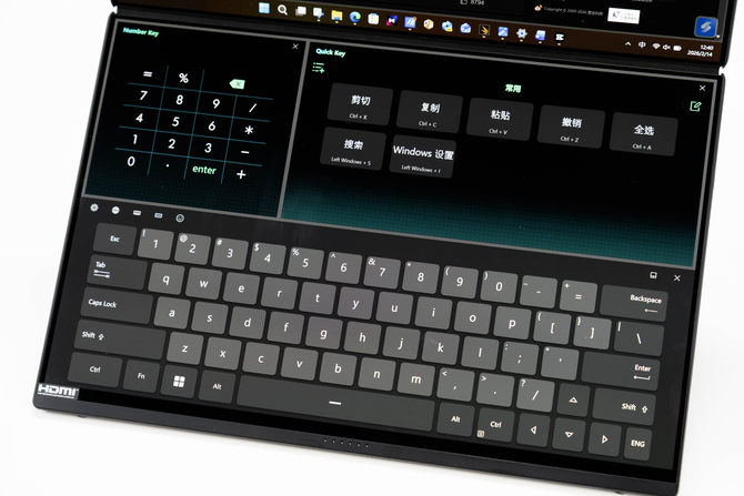 另外,电脑内还设计了方向感应器,在我们进行竖放的时候,华硕灵耀14 双屏2026会自动切换左右双屏模式,类似于两块拓展屏幕使用,提升工作效率、解锁更多玩法。