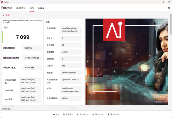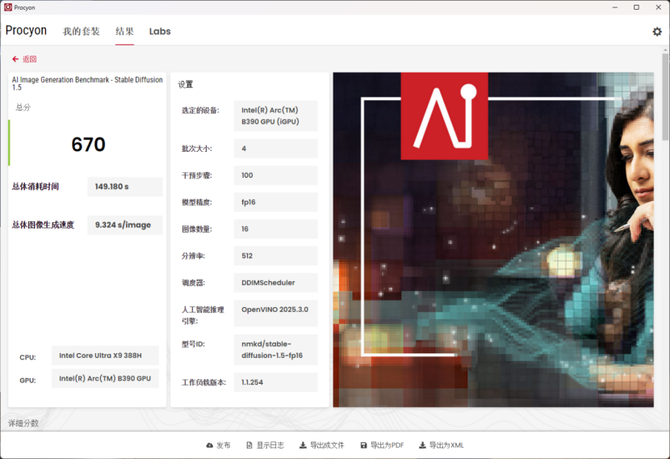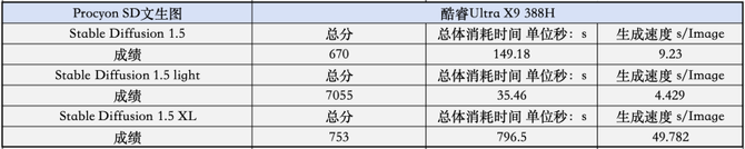 后续,我们使用UL Procyon的AI图片生成跑分进行测试,可以看到在不同类型的模型中,英特尔酷睿Ultra X9 388H的表现都足够优秀,生成效率也非常不错,完全能够满足本地的AIGC要求,对于有本地AI内容创作的用户而言,这样的性能足够给力,一般的后期生成毫无压力。