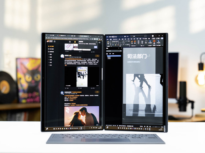 当我们拿下键盘的时候,底下的屏幕就跃然而出,和上半部分的屏幕组成双屏,上图为最常见的“瀑布流”使用方式,让整个屏幕合并成一块屏幕使用,在浏览网页,视频流剪辑的时候,能够显示更多的内容和音视频轨道,带来更高的效率,这是传统的单个屏幕笔记本电脑所不具备的。