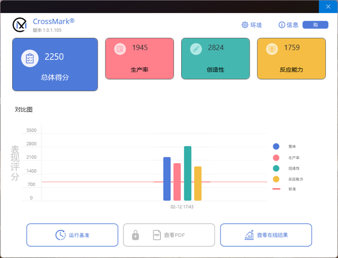CrossMark是一款测量整体平台处理器的软件,可以从我们常见的生产率、创造性和反应能力等方面直接反应整个平台的生产力表现,在这个测试项目中我们可以看到,英特尔酷睿Ultra X9 388H的整体分数来到了2250,性能表现十分优秀。