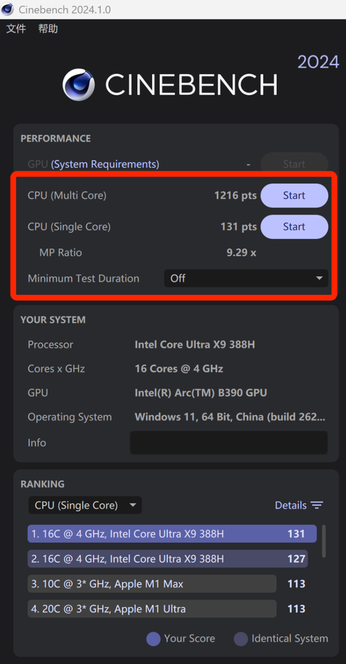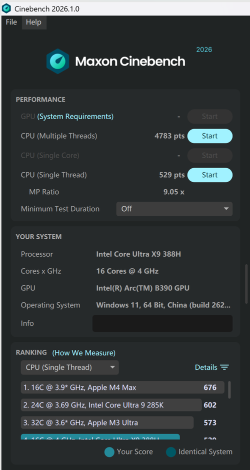 CINEBENCH R23测试成绩方面,英特尔酷睿Ultra X9 388H的多核心分数为20814,单核心分数为2189,CINEBENCH 2024的单核心分数为131,多核心分数为1216,在最新版的CINEBENCH 2026的测试中,我们可以看到处理器的单线程分数为529,多线程分数为4783。