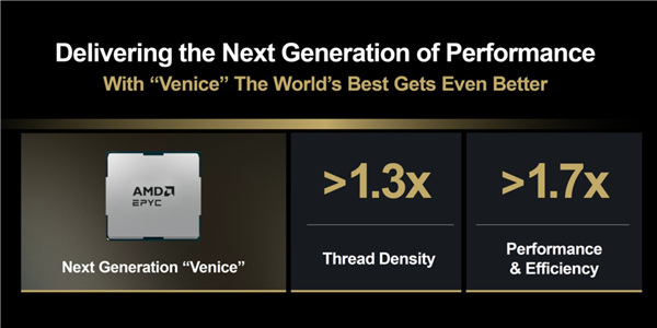 根据AMD之前公布的数据,Venice处理器的线程密度提升了30%,性能及能效则比上代EPYC提升70%之多,而且还不是靠AI运算充数,是实实在在的SPEC基准性能提升。