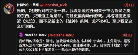 3月2日,知名爆料人NateTheHate进一步透露,新作“设定在《战神》宇宙中,主角将是劳菲”。此外,玩法将区别于北欧篇作品,更强调动作表现。