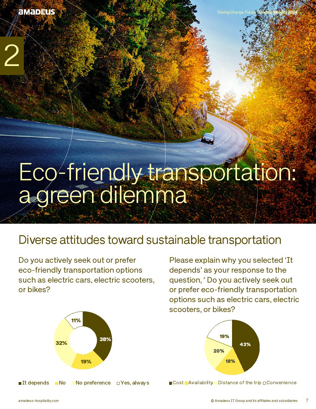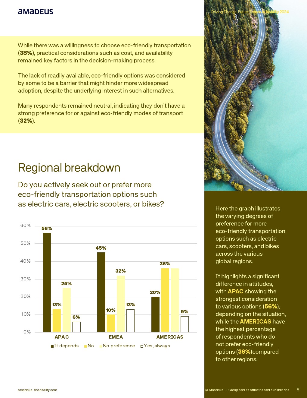在绿色出行方面,38%受访者表示愿意选择环保交通工具,但32%持中立态度,11%始终优先选择环保方案。对“视情况而定”的人群分析显示,43%受成本影响,20%受行程距离制约,19%考虑便利性,18%受可获得性限制。亚太56%表示取决于情境,美洲36%明确不偏好环保选项。环保意识存在,但尚未转化为稳定行为。