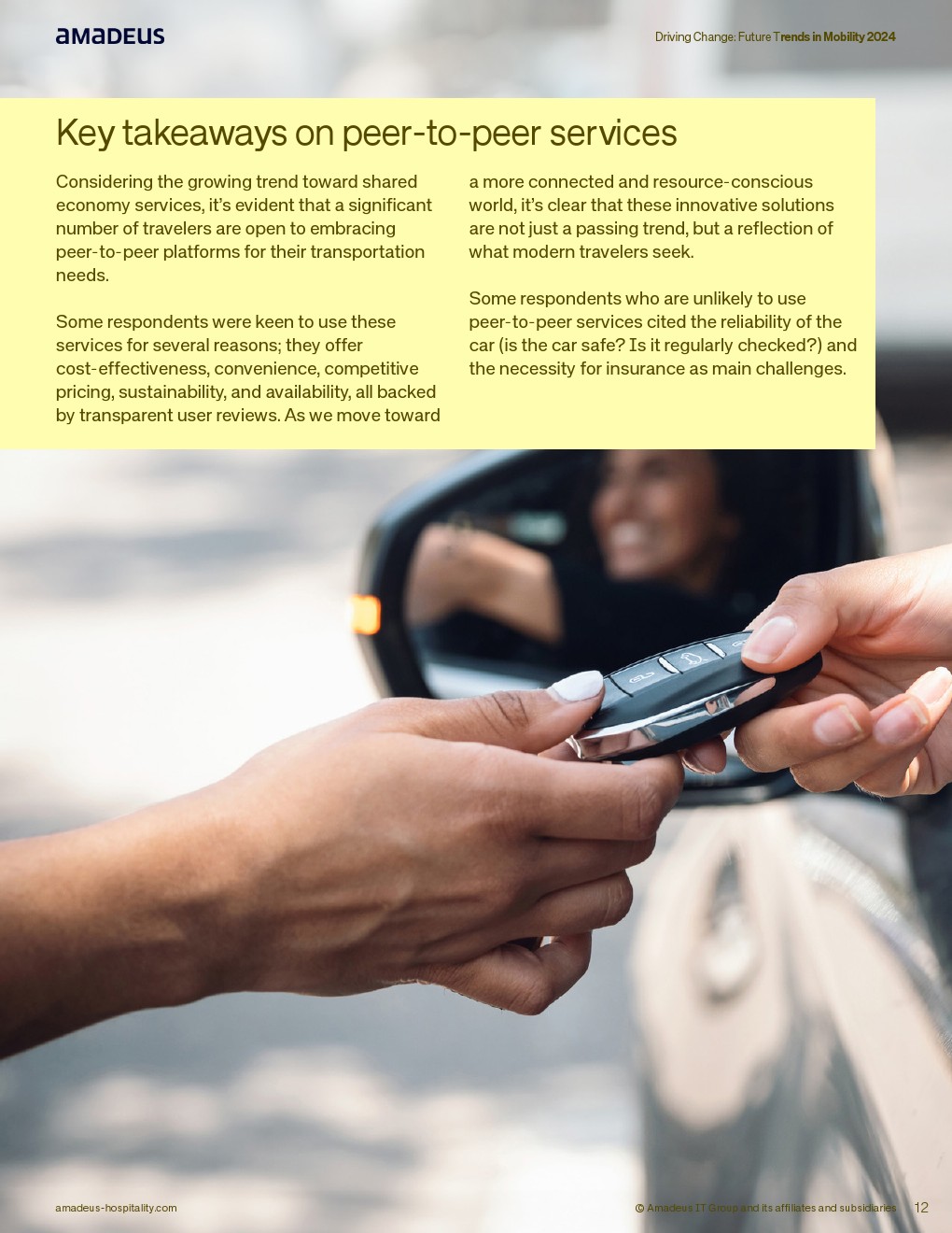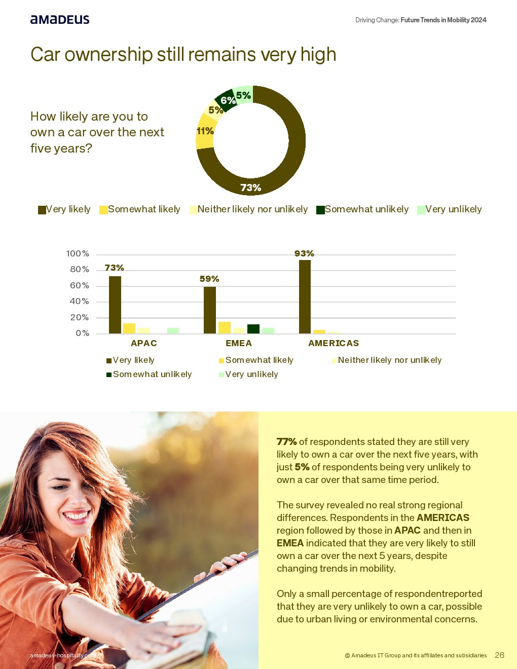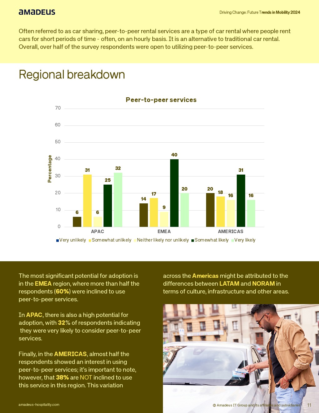共享经济趋势正在增强。超过半数受访者对点对点租车持开放态度,其中EMEA地区60%倾向使用该服务,亚太32%表示“非常可能”,美洲接近一半有兴趣,但38%仍不倾向使用。其吸引力集中在成本优势、便利性与透明评价体系,但车辆安全与保险问题构成阻力。