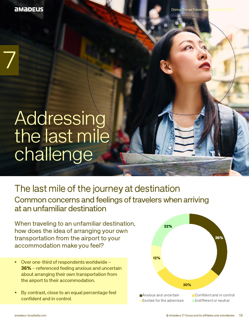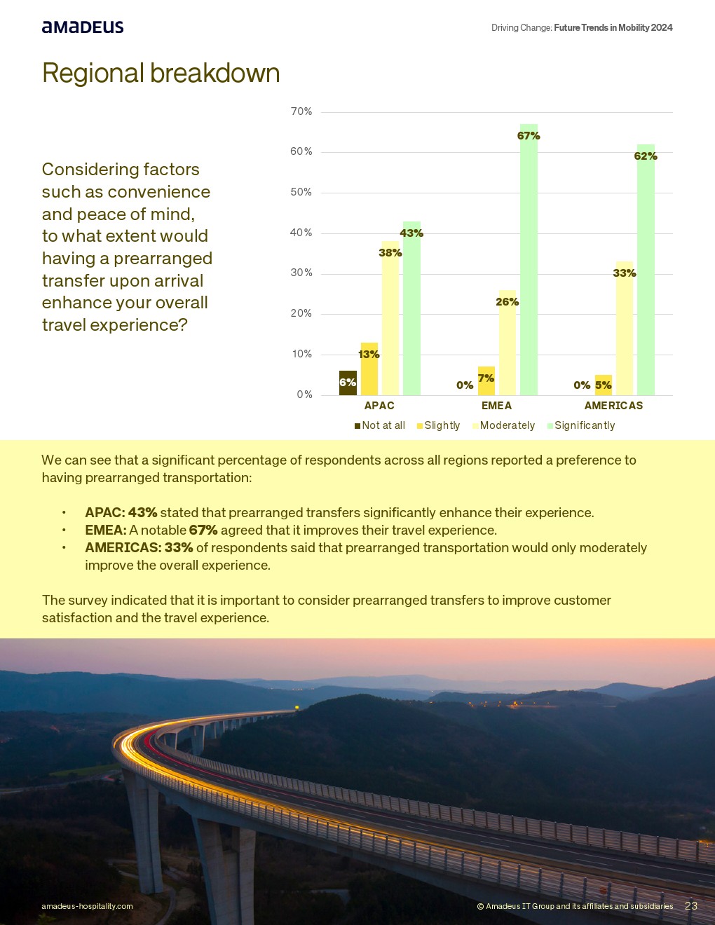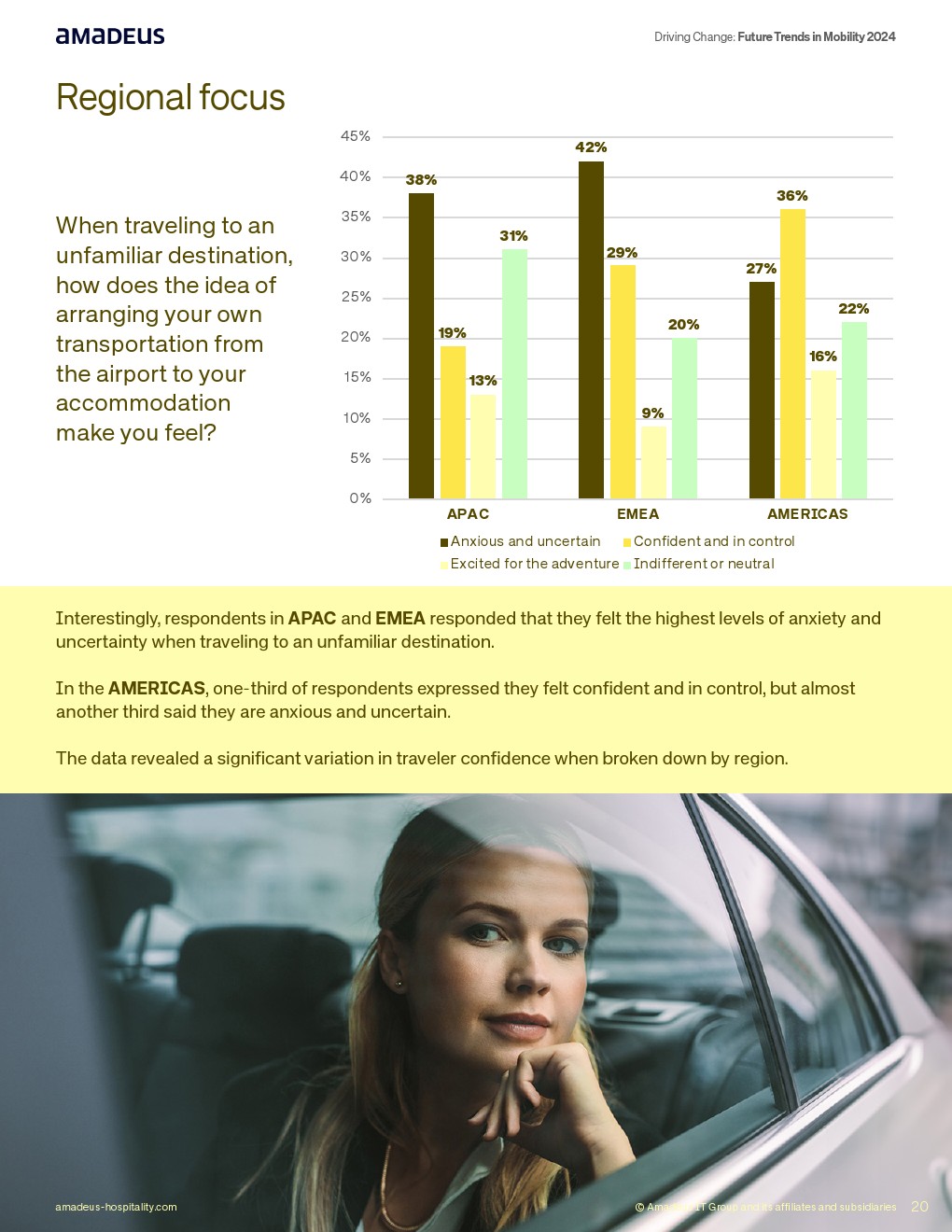 在产品整合层面,66%认为单一出行应用“非常有用”,65%认为一站式预订将提升满意度,其中EMEA高达70%,美洲62%。此外,62%表示预先安排接送将显著改善体验。最后一公里焦虑明显,全球36%在陌生目的地对交通安排感到不安。