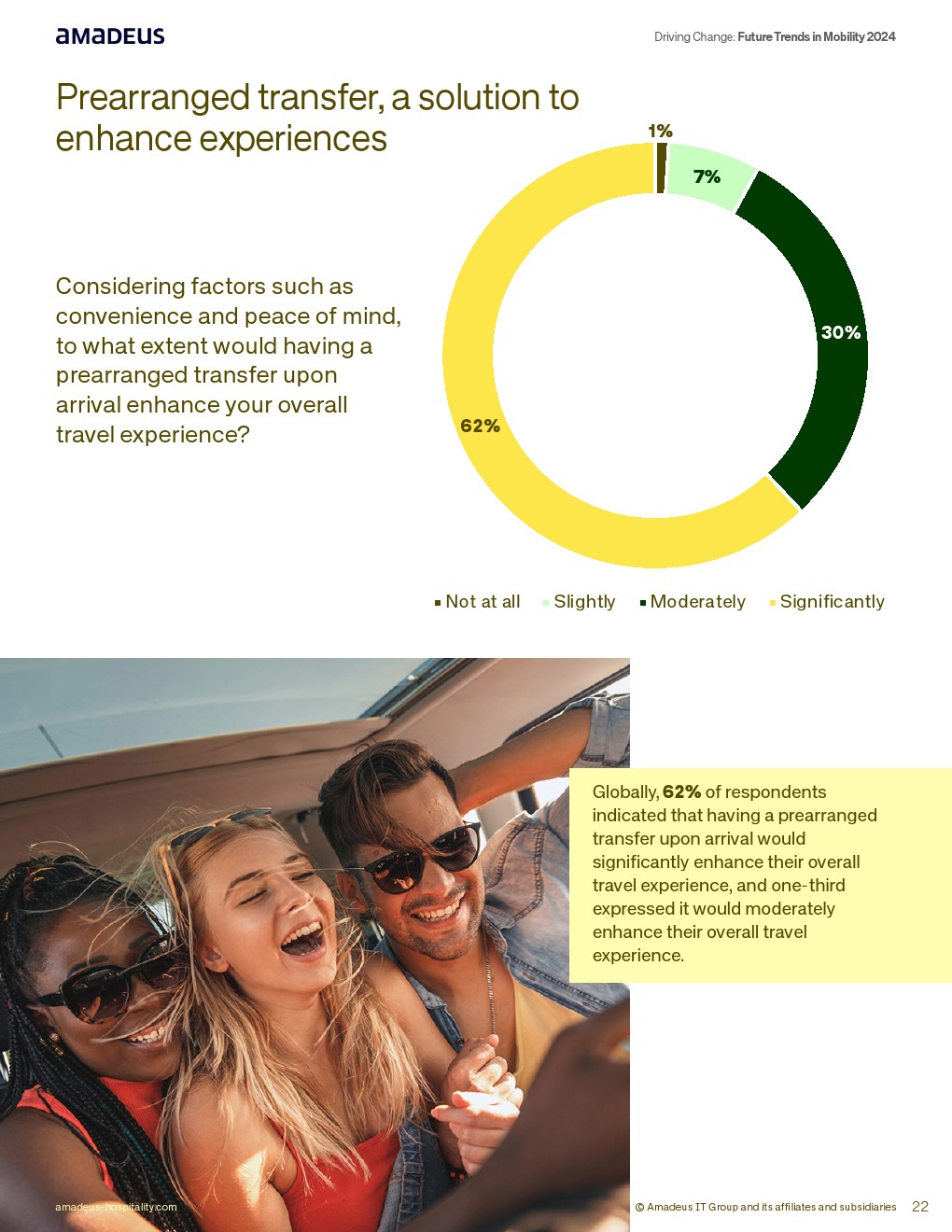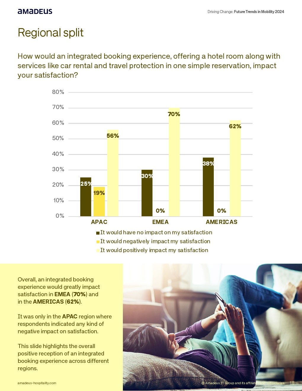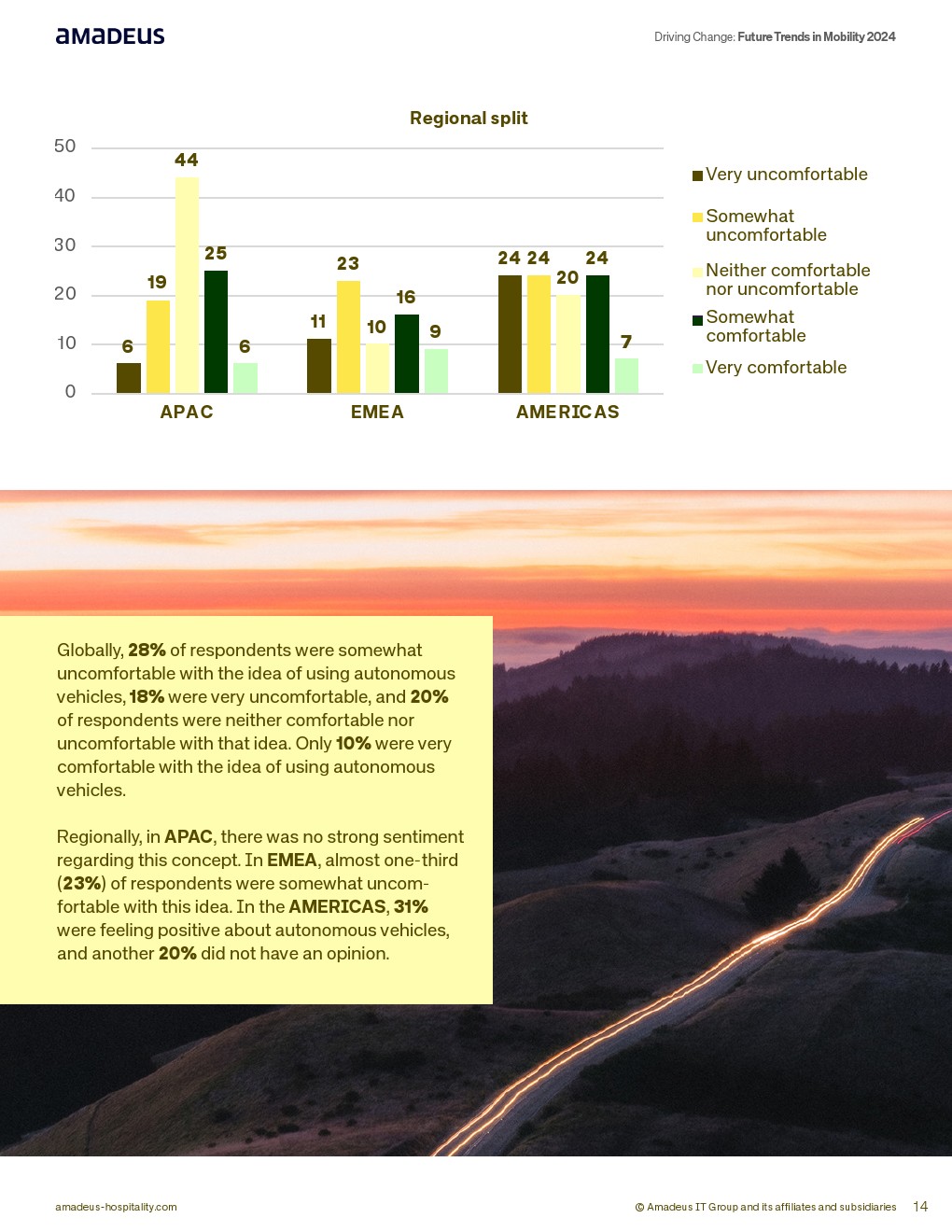 在产品整合层面,66%认为单一出行应用“非常有用”,65%认为一站式预订将提升满意度,其中EMEA高达70%,美洲62%。此外,62%表示预先安排接送将显著改善体验。最后一公里焦虑明显,全球36%在陌生目的地对交通安排感到不安。