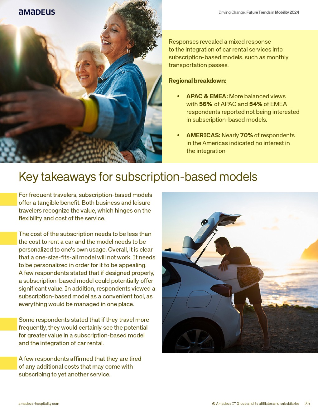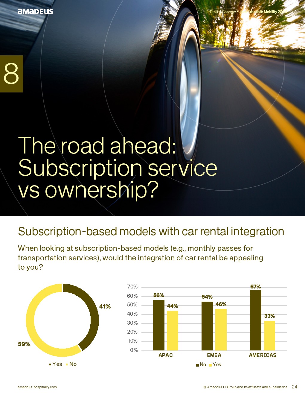 订阅制与拥有模式并存。仅41%对整合租车的订阅模式感兴趣,美洲近70%不感兴趣。然而77%仍计划未来五年拥有汽车,显示传统拥有观念仍占主导。
