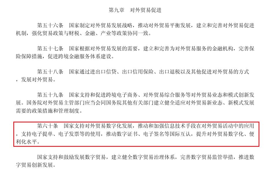 2026年3月1日,新修订的《中华人民共和国对外贸易法》正式施行,其中明确将“支持对外贸易数字化发展”纳入立法范畴,推动和加强信息技术手段在对外贸易活动中的应用,支持电子提单、电子发票等数字化单据使用,推动数字证书、电子签名国际互认,提升对外贸易数字化、便利化水平。