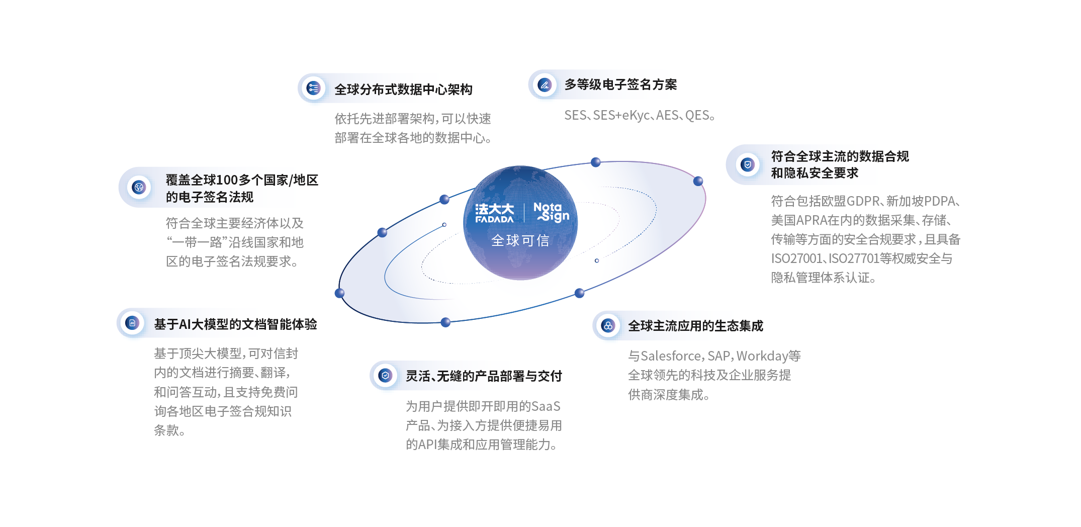● 全球签跨境互认,助力业务通达四海:法大大旗下Nota Sign全球签平台,适配全球超100个国家和地区法规,符合欧盟eIDAS、美国ESIGN Act、新加坡《电子交易法》等国际标准,真正实现电子签名全球互认,契合跨境互认新规。