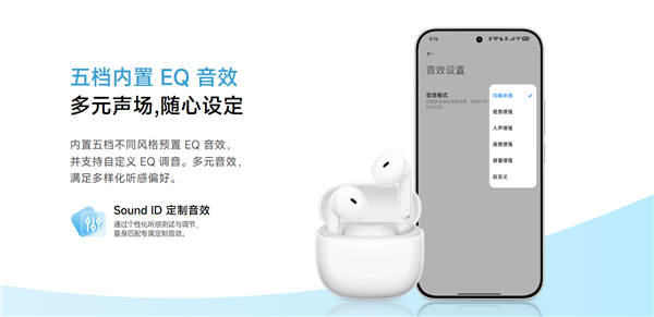 REDMI Buds 8活力版配备14.2mm超大镀钛单元,支持SBC/AAC音频编解码,内置五挡EQ音效,支持自定义EQ调音。