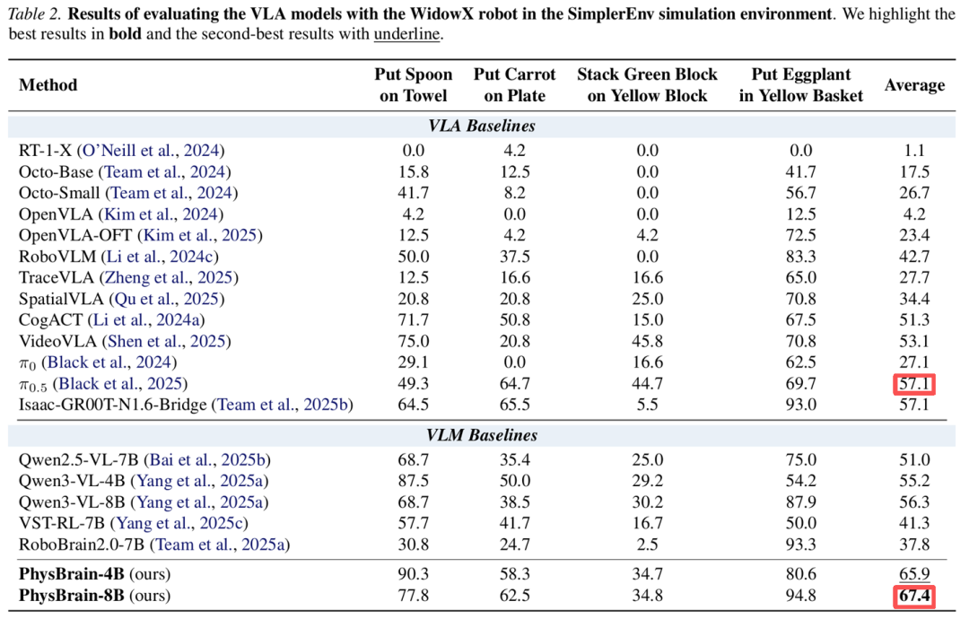 利用这套方法,他们构建了数据集 E2E-3M,并用该数据集训练了一个具身大脑 ——PhysBrain。在完全未出现在训练集中的 SimplerEnv 四个操作任务上,PhysBrain(8B 版本)以 67.4% 的平均成功率力压行业标杆、Physical Intelligence 的 Pi0.5,领先优势达 10%。