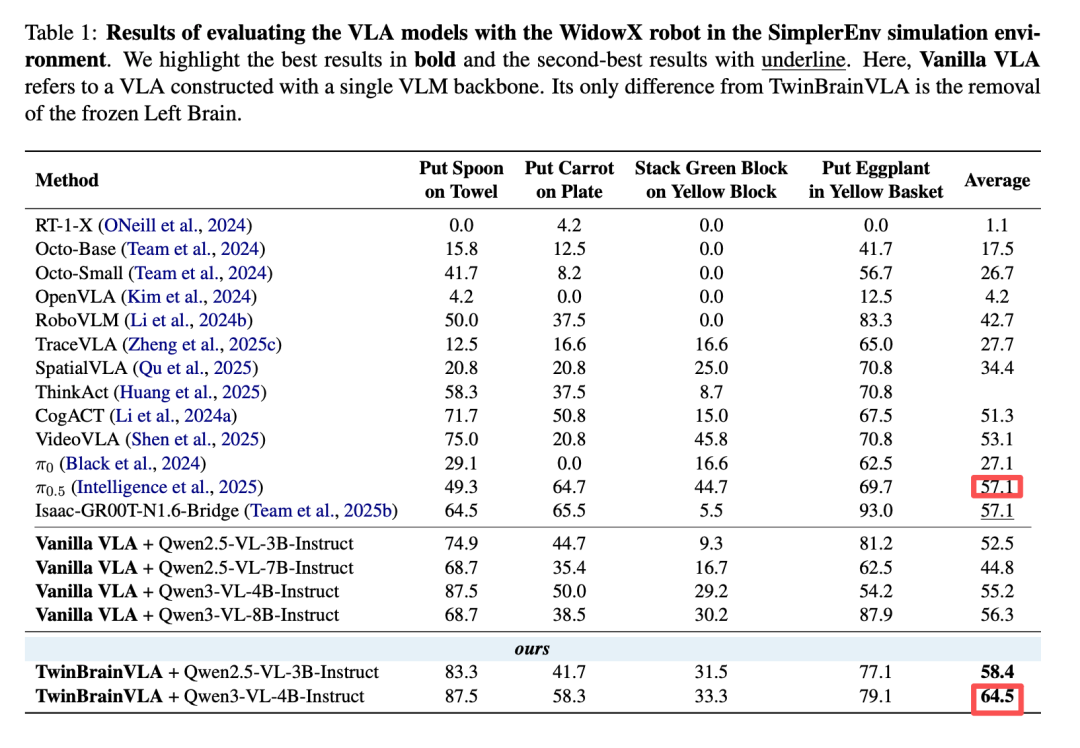 实验阶段,深度机智在完全未出现在训练集中的 SimplerEnv 四个操作任务上验证了 TwinBrainVLA 的有效性:在数据量远远小于 Pi0.5 的前提下,TwinBrainVLA 将原生的 Qwen3-VL-4B 能力有效迁移到机器人控制任务上,在 480 次独立测试中的平均成功率达到 64.5%,远超使用了数万小时轨迹数据的 Pi0.5(57.1%)。它证明了保住大模型的底子,本身就能换来更高的性能上限。