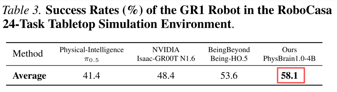 这种领先优势在其他具有挑战性的场景中得到了进一步验证。在 RoboCasa 上,PhysBrain1.0 仅使用千小时人类第一视角数据做 VLM 增强,就达到 58.1% 成功率,拿下 SOTA。这个测试强调多阶段家庭场景操作,考察的是长程规划与稳定执行能力,结果说明模型已具备真实场景落地的潜力。