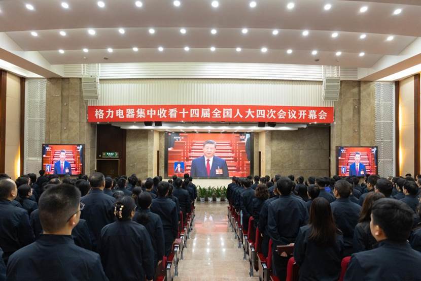 上午9点,随着国歌声与掌声响起,十四届全国人大四次会议正式开幕。格力电器报告厅内气氛庄重而热烈,全体参会人员聚精会神,一边仔细聆听政府工作报告,一边认真记录要点。大家一致认为,政府工作报告回顾过去成绩实事求是、振奋人心,擘画未来发展蓝图高瞻远瞩、举措有力,不仅为国家新一轮的高质量发展指明了方向,也为中国制造业企业的转型升级提供了根本遵循和强大动力。
