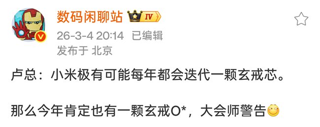【iMobile爱科技资讯】MWC 2026巴塞罗那期间,小米集团总裁卢伟冰接受CNBC采访时宣布,自研手机芯片“玄戒”系列,将实现一年一迭代。国内数码大V“数码闲聊站”也爆料,今年将会有一颗新芯片发布。