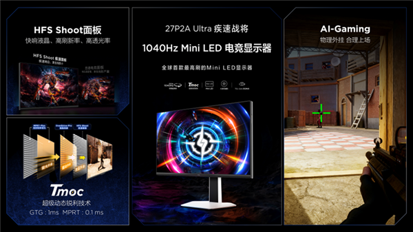 “疾速战将”P2A Ultra则以1040Hz刷新率成为全球首款最高刷Mini LED电竞显示器,作为将所有研发资源倾注于打造最快的电竞神器,其采用联合TCL华星定制HFS Shoot原厂极速屏,从材料、驱动到封装全面升级。