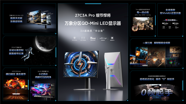 "细节悍将"27C3A Pro专为3A画质玩家打造,将Mini LED的开创者优势浓缩于桌面,支持2304个万象分区、XDR 2200尼特亮度、QLED绚彩量子点,实现“一区顶多区”的极致控光效果。
