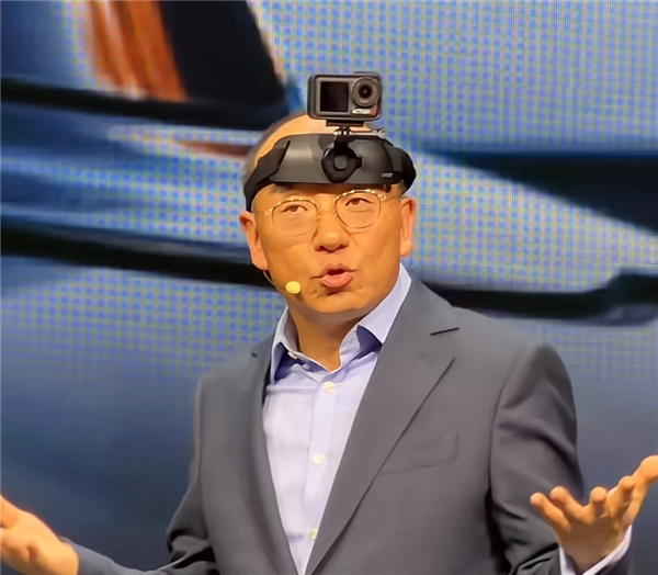 发布会现场,冯擎峰还用上了行为艺术式的演示:他身穿西装、头戴运动相机走上舞台,询问现场观众是否觉得难看。