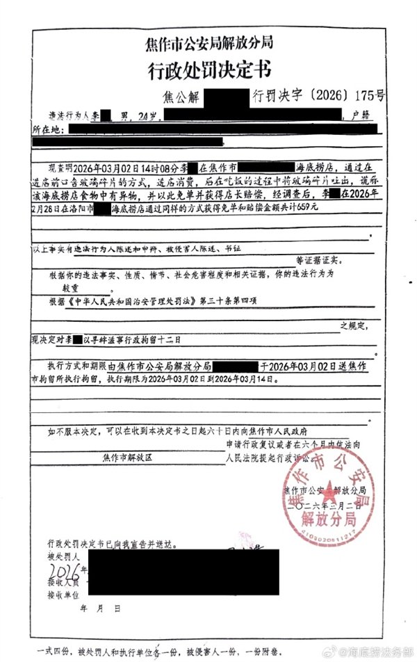 其中一份行政处罚决定书显示,今年3月2日,一名男子在焦作市一家海底捞门店就餐时,先是在进店前口含玻璃碎片,随后在用餐过程中将玻璃吐出,谎称食物中出现异物,并以此要求免单并获得店长赔偿。