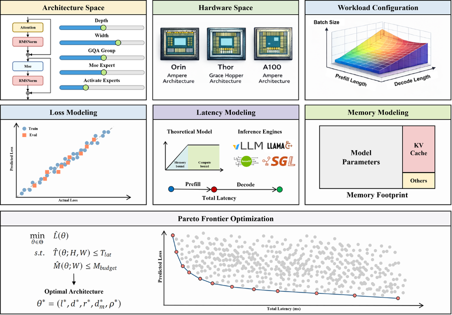 在两个模型的基础上,理想开发了 PLAS(帕累托最优 LLM 架构搜索)框架。你可以把它理解为一个「自动选配师」。给它输入芯片的硬件参数(算力、带宽、缓存层次)和工程约束(延迟、功耗、内存),它就能自动吐出最优的模型架构方案。