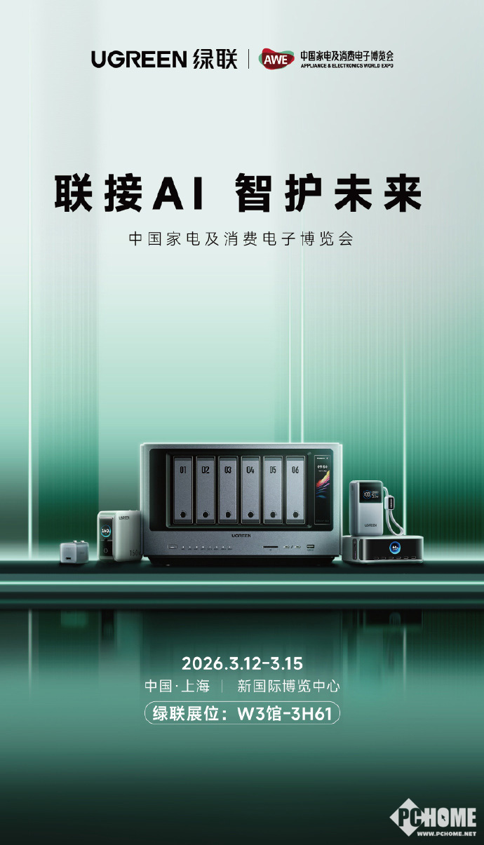 PChome 3月5日消息,UGREEN绿联正式官宣首次参展AWE,其展位位于W3创新科技展区3H61,以 “联接 AI,智护未来” 为主题,聚焦数据安全与用电安全两大核心,携AI私有云、智能充电、家庭安防三大生态矩阵亮相,并将于3月12日下午1:30举办专场品牌发布会,发布重磅新品、官宣跨界合作,全面展现从消费电子配件到全场景智能硬件的战略升级。