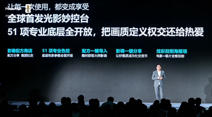 海信UX2026款搭载行业首创光影妙控台,内置大师级调色方案可一键复刻专业画质,更开放 51 项核心参数支持资深玩家精细调节,更有调色配方商店,未来将汇集导演与专业调色师的大师方案,支持一件复制,普通用户也能轻松调出专业级画面,解锁画质调试互动新体验。